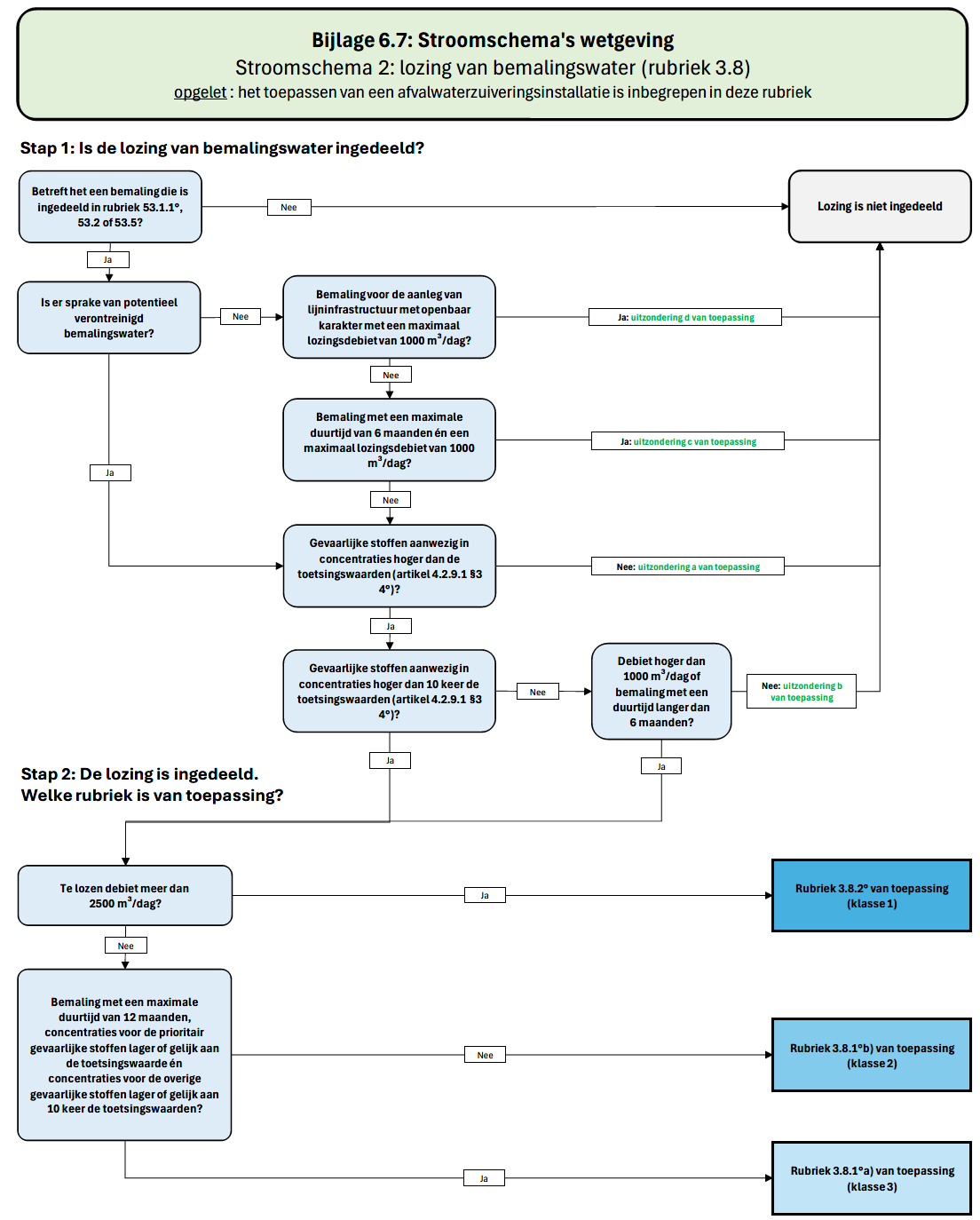 Voor bemalingen in Vlaanderen zijn Vlarem-rubrieken 53.2, 53.11 en 3.8 van belang.